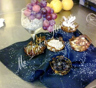 Canastas de caramelo, rellenas con praline y frutas secas, arrollados de crema y frutas de estacion